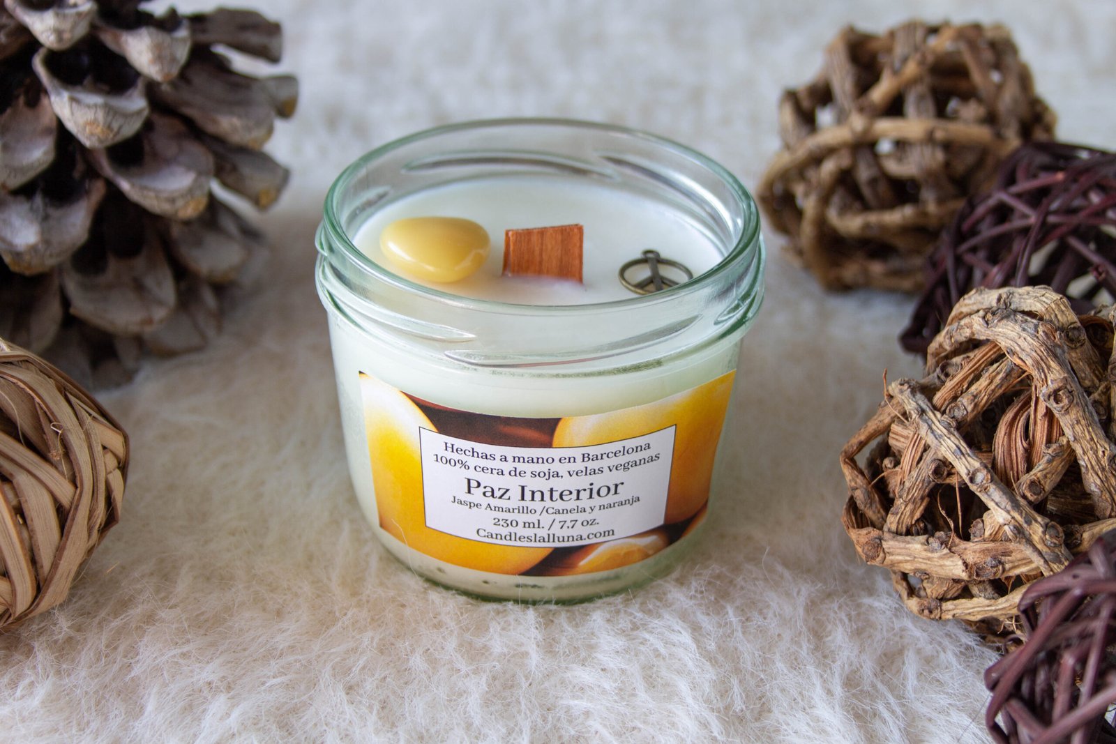 Presentada en un tarro de cristal con tapa en dos tamaños disponibles: 125 ml y 230 ml, esta vela se adapta a cualquier rincón de tu hogar 🏠. Pero lo que la hace aún más especial son los dos colgantes que la acompañan. Un corazón de Jaspe Amarillo, conocido por sus propiedades de equilibrio y paz interior 💛, te permitirá llevar su energía positiva contigo a donde quiera que vayas. Además, un colgante en forma del símbolo de la paz añade un recordatorio constante de la tranquilidad que esta vela busca proporcionar ☮️.