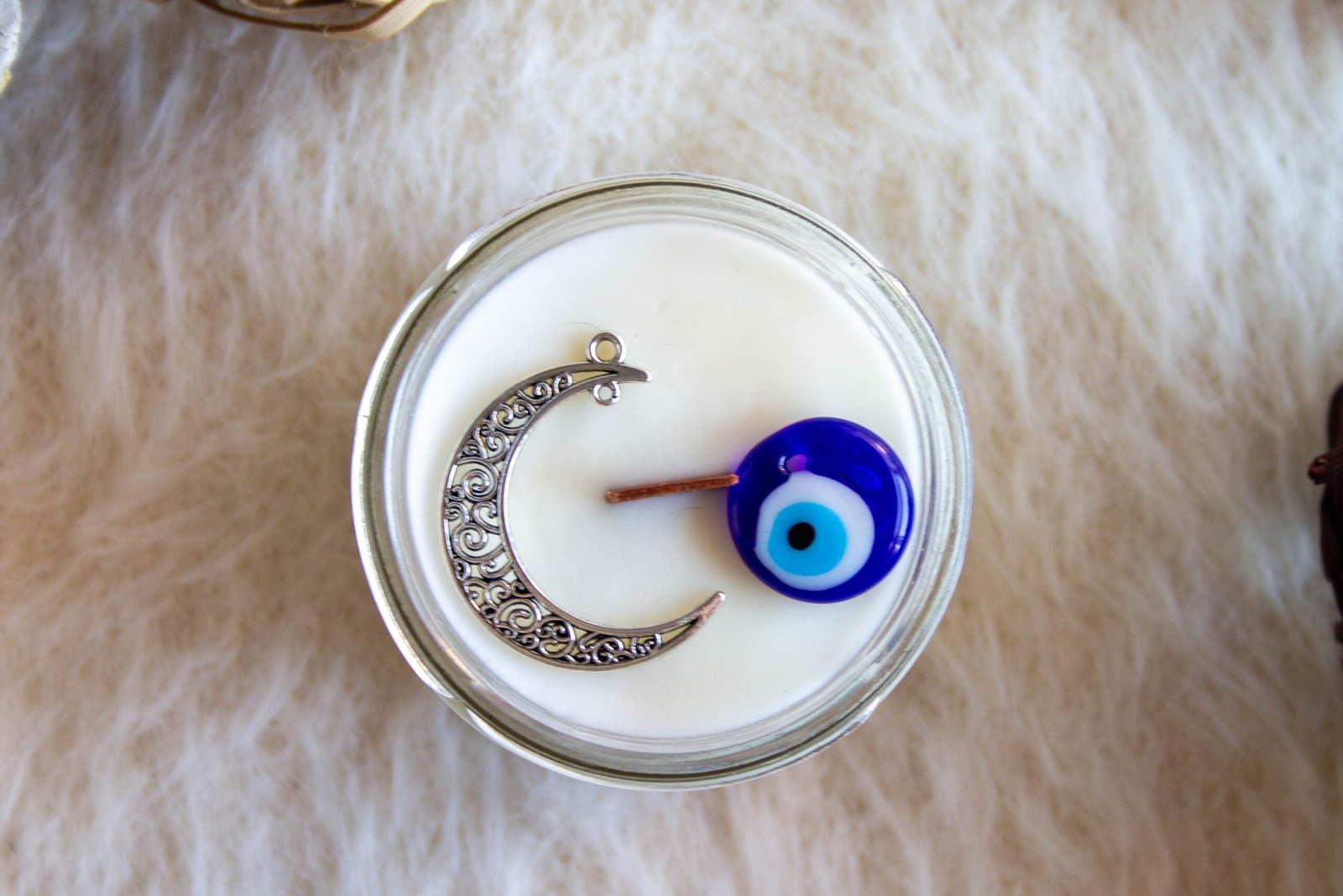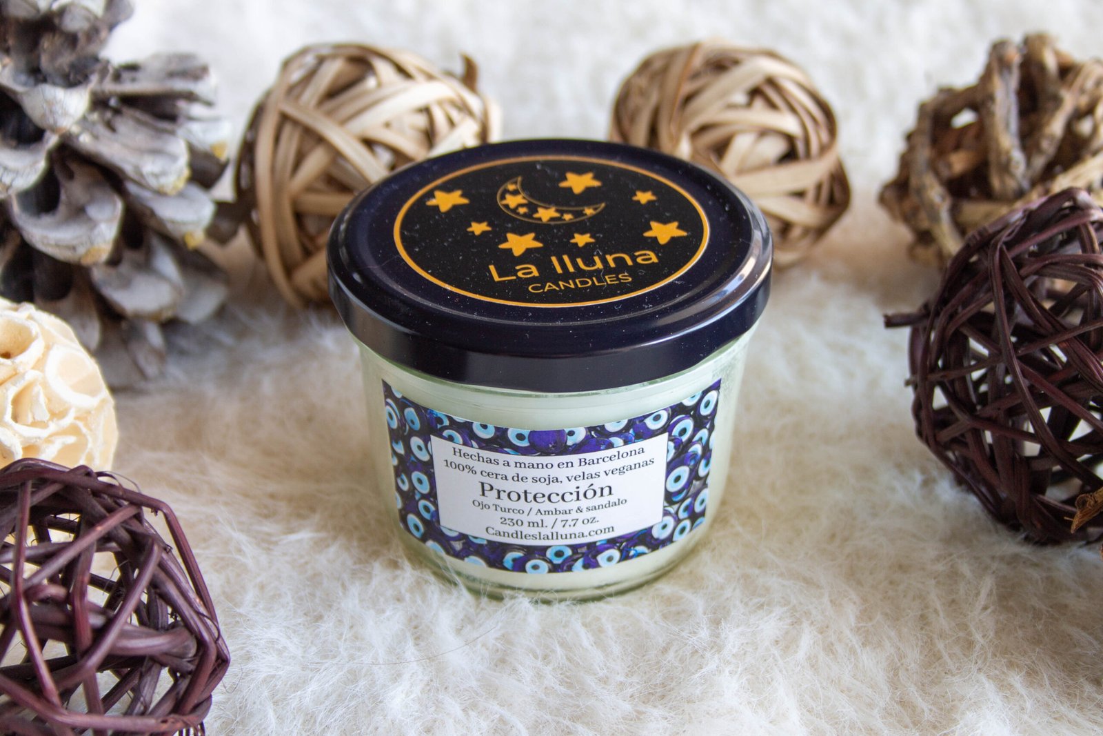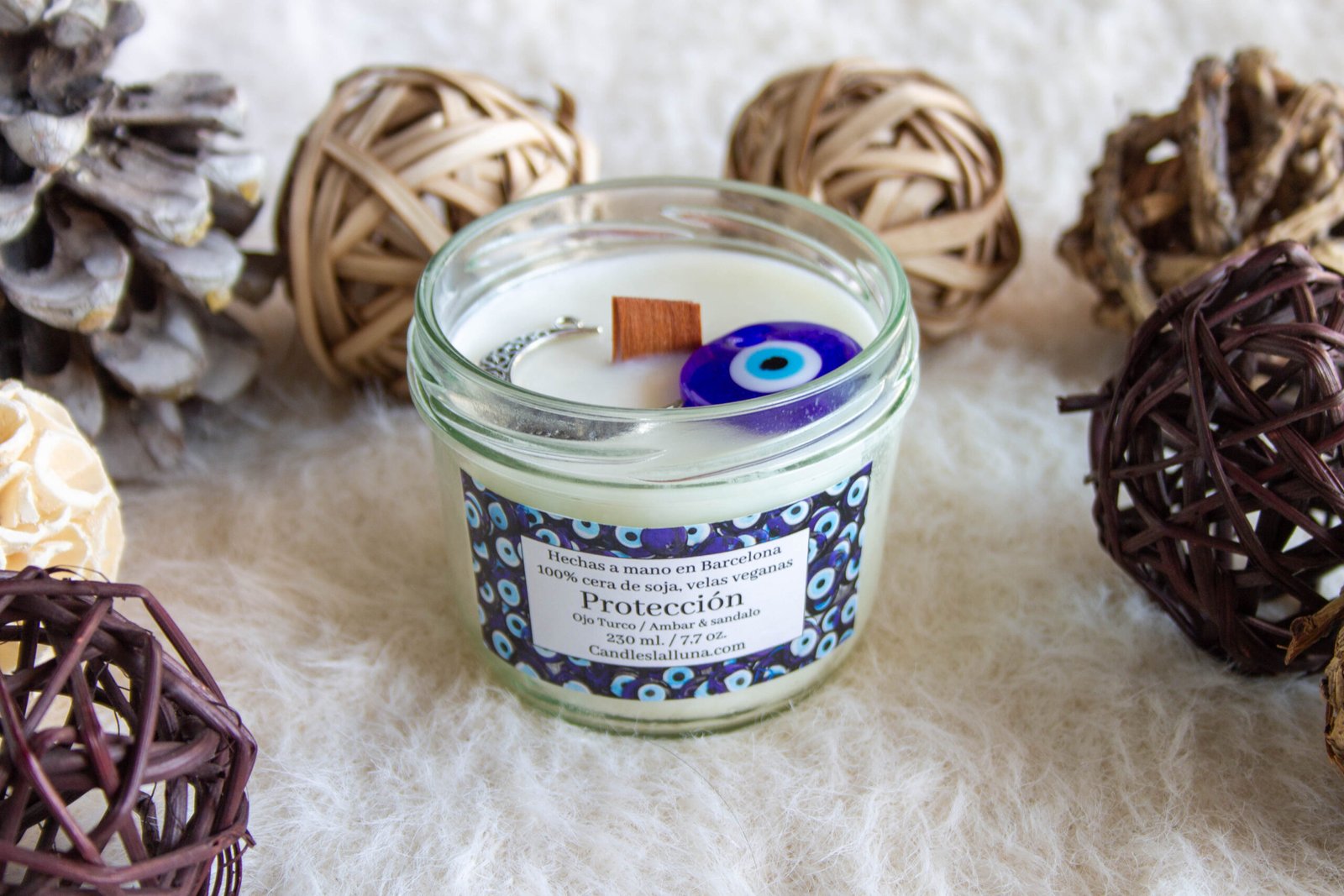 Presentada en dos tamaños: 125 ml y 230 ml, en un tarro de cristal con tapa, esta vela se adapta a cualquier rincón de tu hogar. Lo que la hace aún más especial son los dos colgantes que la acompañan: un amuleto Ojo Turco, conocido por su capacidad de protección contra las energías negativas, y un colgante en forma de luna, que simboliza la armonía y el equilibrio en tu vida.