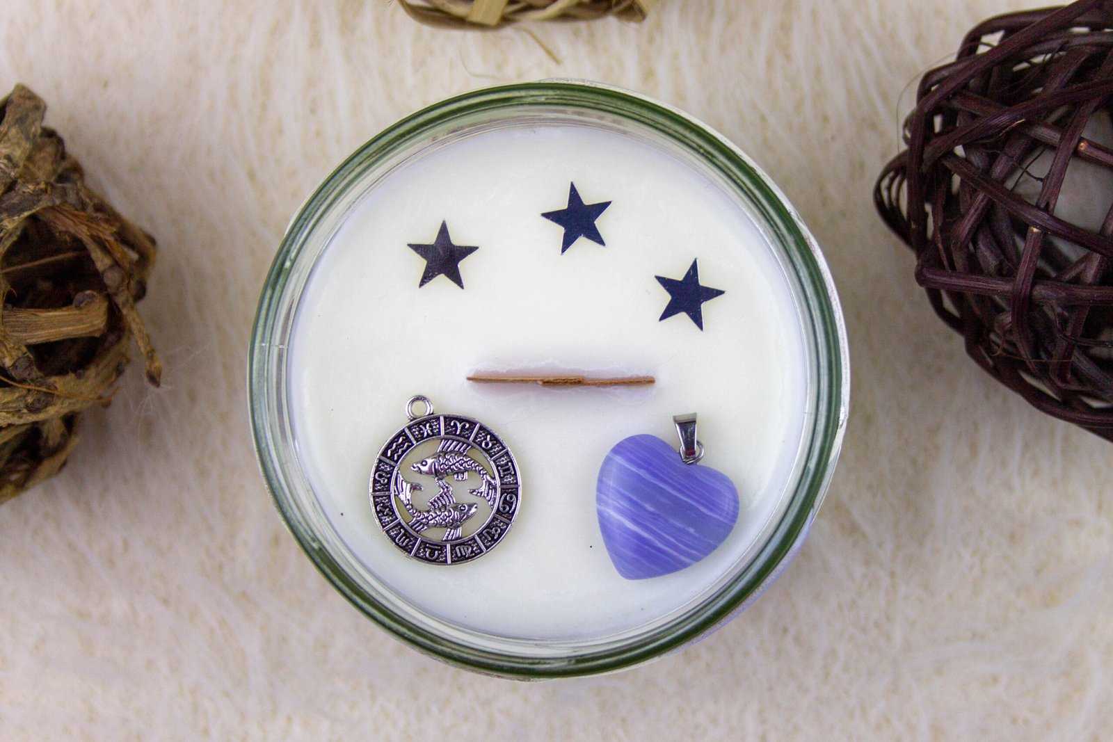 La mecha de madera que chisporrotea al encenderse añade un toque encantador, transformando tu espacio en un oasis de tranquilidad y conexión. Con un formato de 230 ml, esta vela es perfecta para realzar la espiritualidad y la sensibilidad de Piscis en cada rincón de tu hogar. Cada vela incluye un colgante de ágata azul en forma de corazón, la piedra preciosa que potencia las características únicas de este signo de agua y compasión. 💙💖 Y para llevar contigo el símbolo de tu identidad zodiacal, también se incluye un colgante con la forma del signo Piscis. ♓🌟