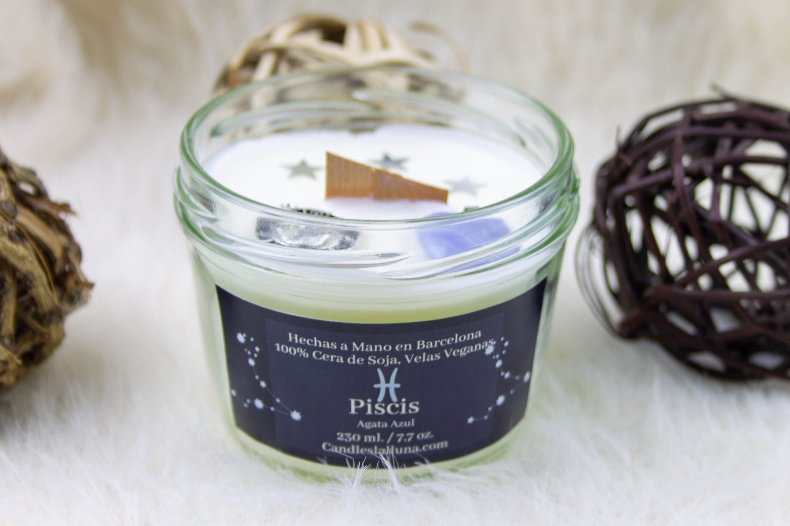 Descubre la magia de nuestra vela vegana de cera de soja, diseñada para capturar la esencia intuitiva y apacible de los nacidos bajo el signo de Piscis. 🌌🔥